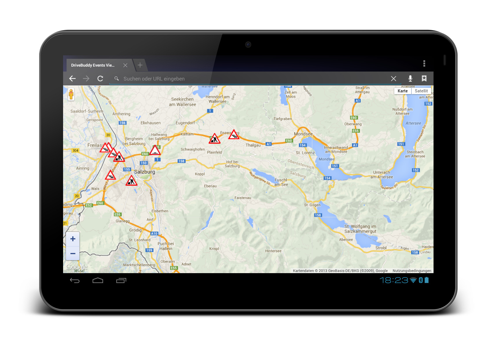 Damit DriveBuddy den Fahrer nicht nur während der Fahrt unterstützen kann, sondern auch schon bei der Planung seiner Route, wird es in Zukunft eine Kartenansicht der aktuellen Geschehnisse geben. Diese Karte zeigt alle aktuellen Gefahren und Verkehrsbehinderungen auf einen Blick.
